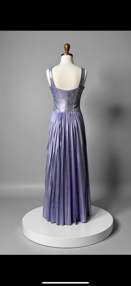مصنوع من قماش فخم لامع بجودة عالية، يتميز بملمسه الناعم وانسيابيته الرقيقة التي تمنحك راحة طوال فترة الارتداء. تم تطريزه يدويًا ببلورات كريستالية دقيقة تضيف بريقًا أنثويًا مذهلاً، مع بطانة داخلية خفيفة لضمان ثبات الشكل وانسيابية الحركة.